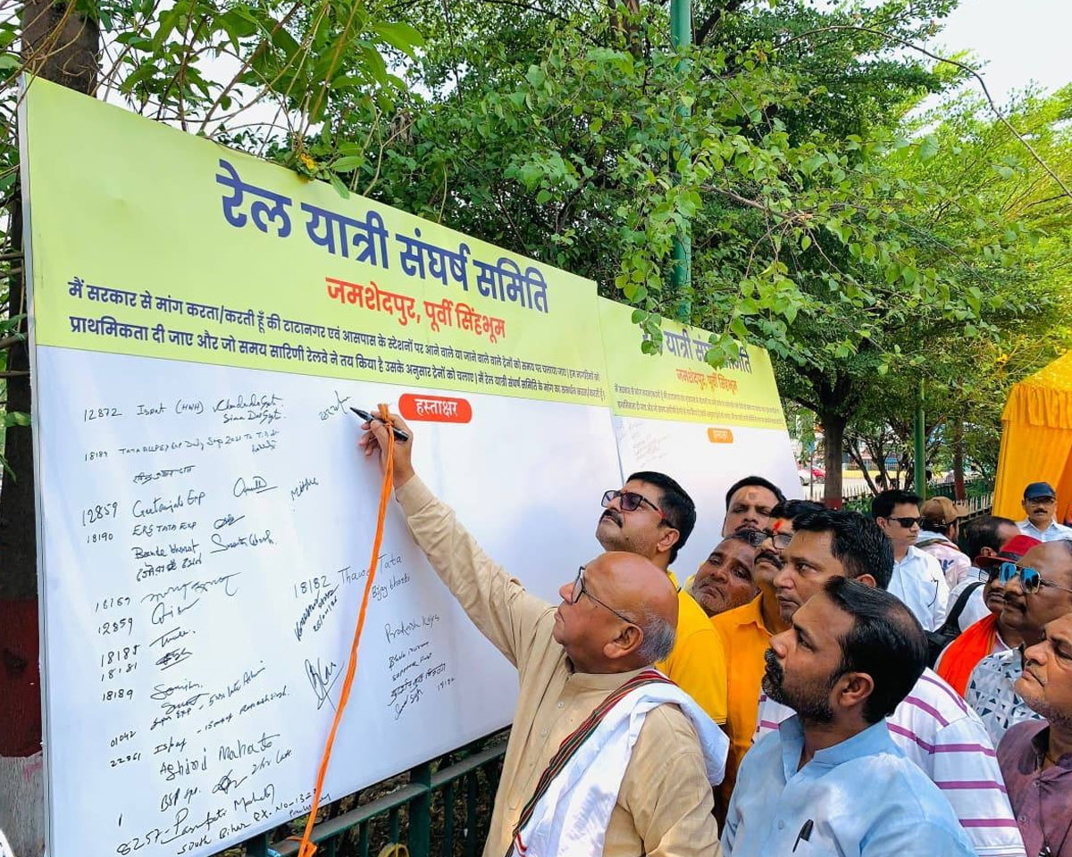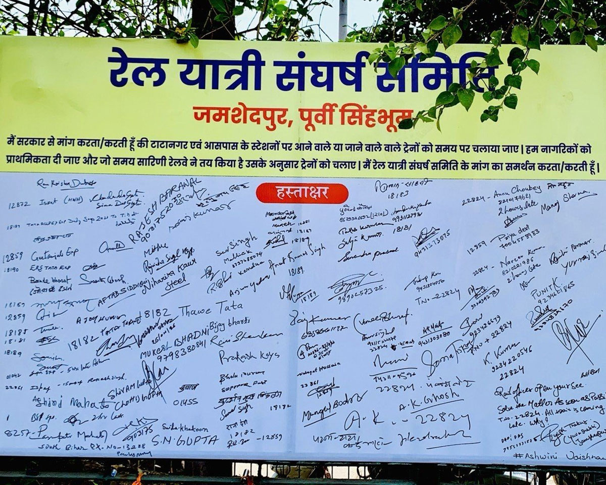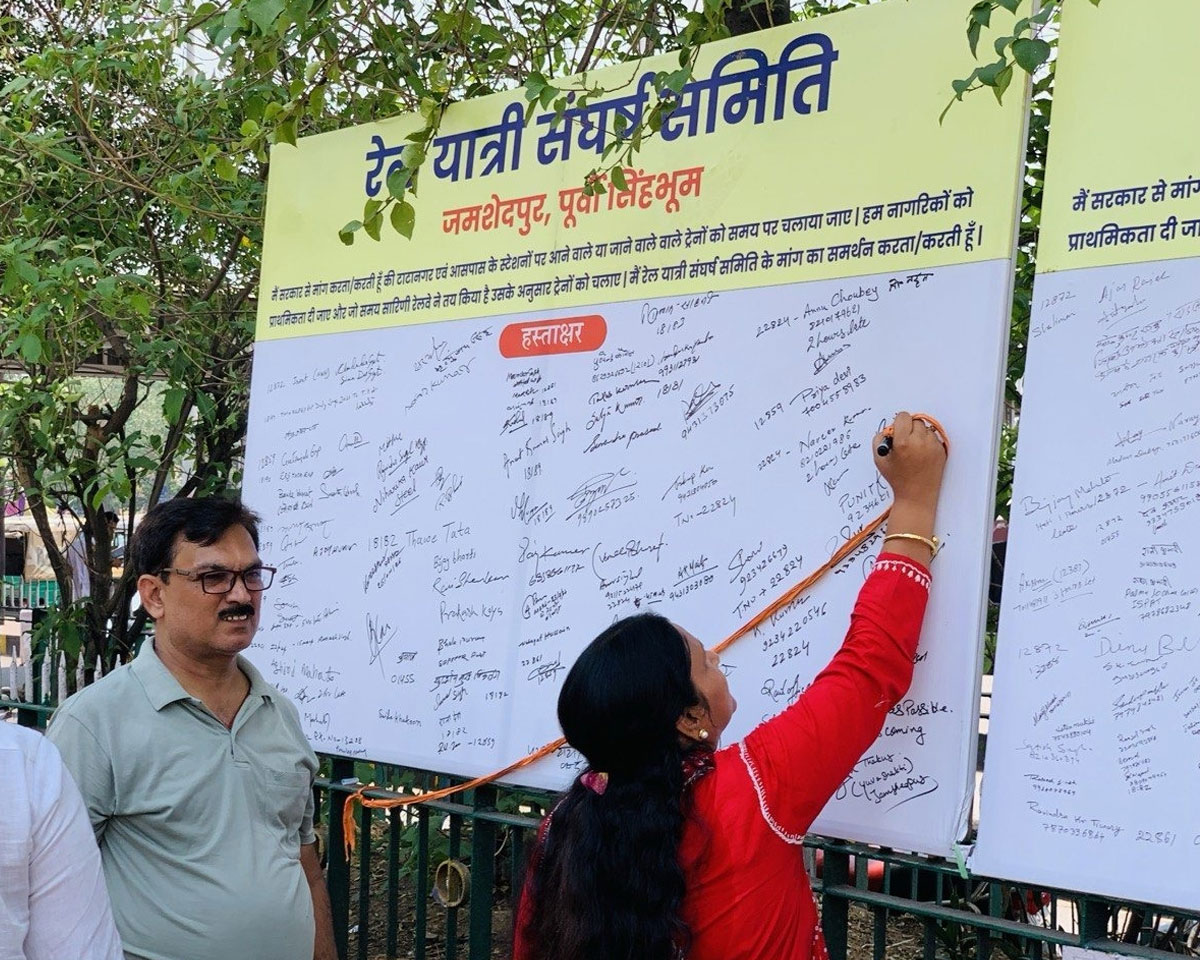 भीषण गर्मी में ट्रेनों की लेटलतीफी के विरुद्ध टाटानगर स्टेशन परिसर में रविवार को रेल यात्री संघर्ष समिति के तत्वावधान में हस्ताक्षर अभियान चलाया गया। तपती धूप में हस्ताक्षर अभियान की शुरुआत जमशेदपुर पश्चिम के विधायक सरयू राय ने खुद हस्ताक्षर करके की। इसके बाद रेल यात्रियों ने ह्वाइट बोर्ड पर हस्ताक्षर किये। लोगों ने स्वतःस्फूर्त भाव से हस्ताक्षर किये और कई लोगों ने तो उसी वक्त सोशल मीडिया पर वीडियो भी पोस्ट कर दिया।